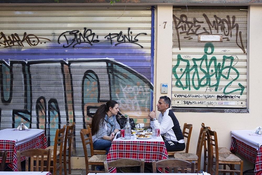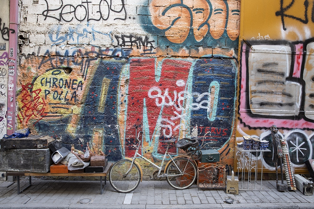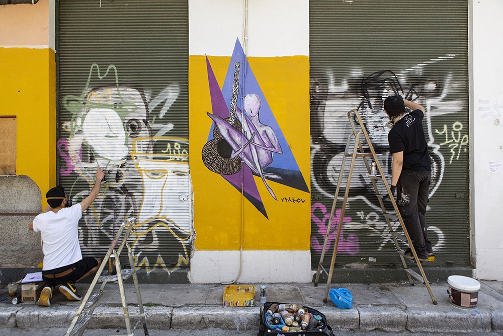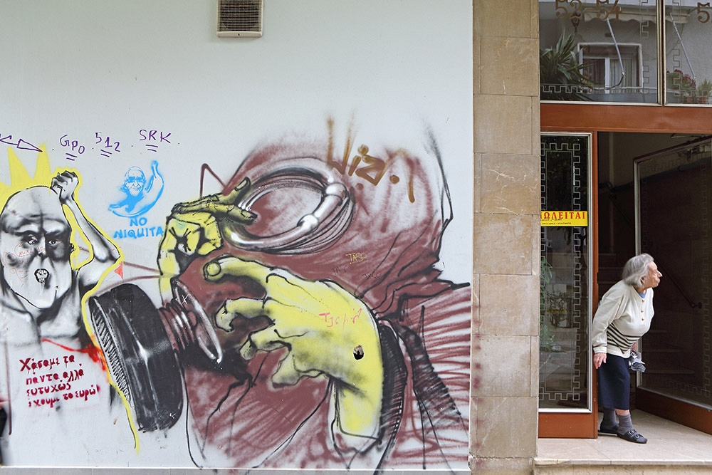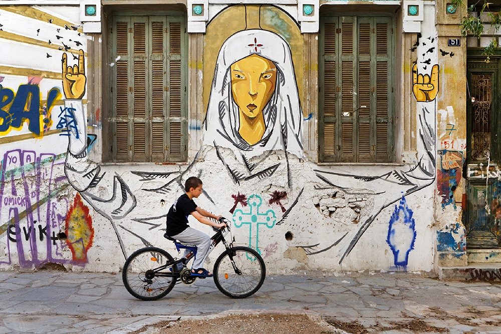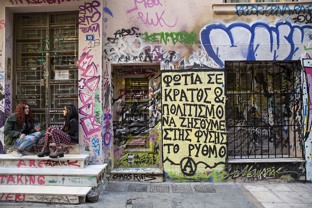Avec la crise économique qui frappe la Grèce depuis plus de 7 ans, les interminables souffrances d’une grande partie de la population sont particulièrement ressenties dans les milieux urbains. Ceci a inspiré une forme d’art de rue (street art) qui est surtout florissante dans les quartiers du centre d’Athènes comme Exarcheia, Votanikos, Gazi et Psiri, les derniers étant tout proches du centre touristique de Thission et Monastiraki. Plusieurs bâtiments étant laissés à l’abandon, le travail de ces artistes de rue a été grandement facilité. Parfois, cette expression artistique est même encouragée et organisée par des associations de quartier.
